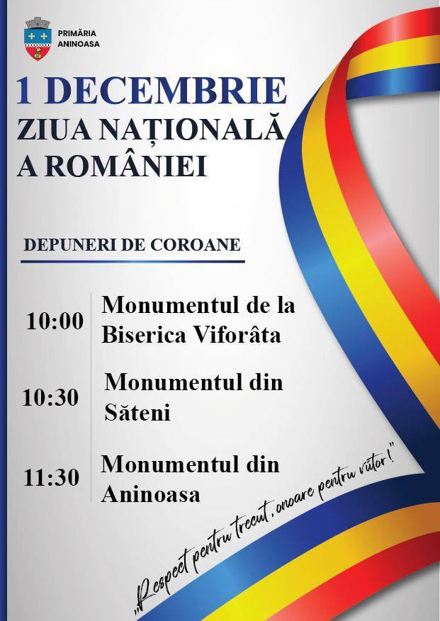 Primăria Aninoasa organizează luni, 1 decembrie 2025, manifestări dedicate Zilei Naționale a României. Evenimentele vor avea un caracter solemn, cu depuneri de coroane de flori în memoria eroilor neamului, în trei puncte din comună.