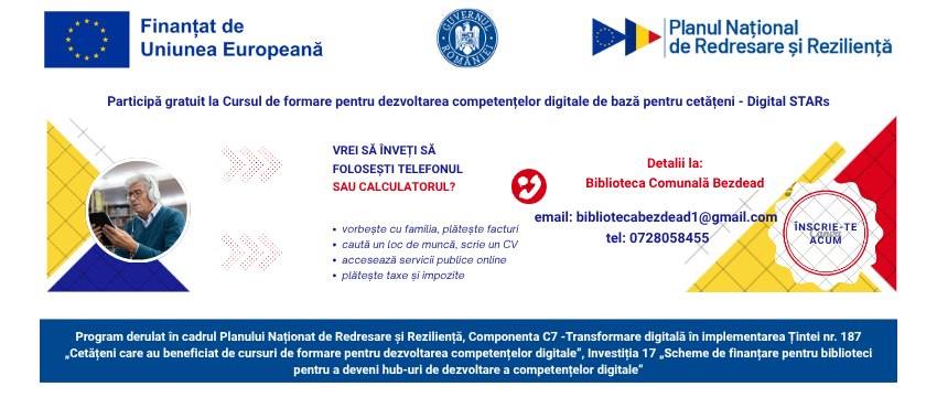 Biblioteca Comunală „Vasile Voiculescu” din Bezdead a anunțat deschiderea înscrierilor pentru cursurile gratuite de formare digitală, destinate cetățenilor români cu vârsta de peste 16 ani. Programul urmărește dezvoltarea abilităților digitale utile atât în viața cotidiană, cât și în cea profesională.