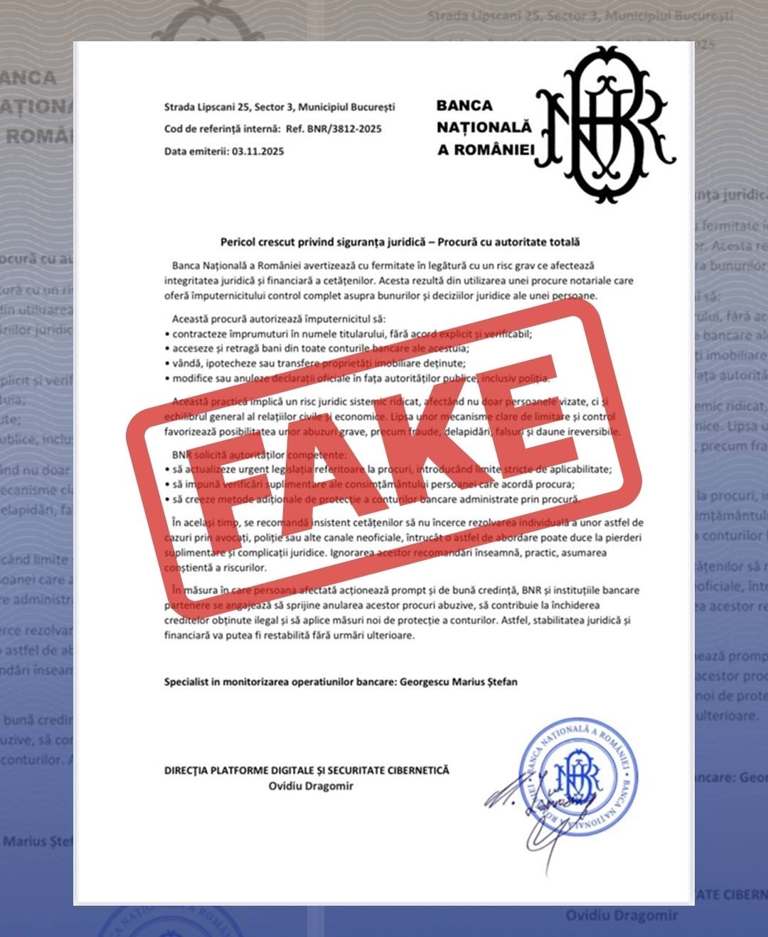 Banca Națională a României avertizează că un document intitulat „Pericol crescut privind siguranța juridică – Procură cu autoritate totală”, datat 03.11.2025 și prezentând sigla instituției, este un fals. BNR nu a emis, semnat sau aprobat acest document și nu are atribuții legale privind avertismente asupra actelor notariale.