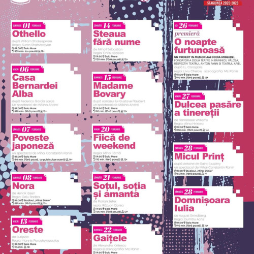 Invitație la cultură! În luna februarie 2026, Teatrul Tony Bulandra din Târgoviște își așteaptă spectatorii cu numeroase spectacole, care vor fi puse în scenă la sediul instituției din Bulevardul Carol I, nr.