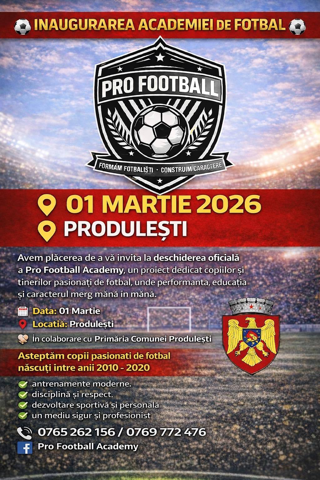 Comuna Produlești va deschide, începând cu 1 martie 2026, Pro Football Academy, o nouă academie dedicată copiilor și tinerilor pasionați de fotbal, potrivit %source%. Proiectul promite un cadru organizat pentru pregătire sportivă, educație și dezvoltare personală, într-un mediu sigur și profesionist.