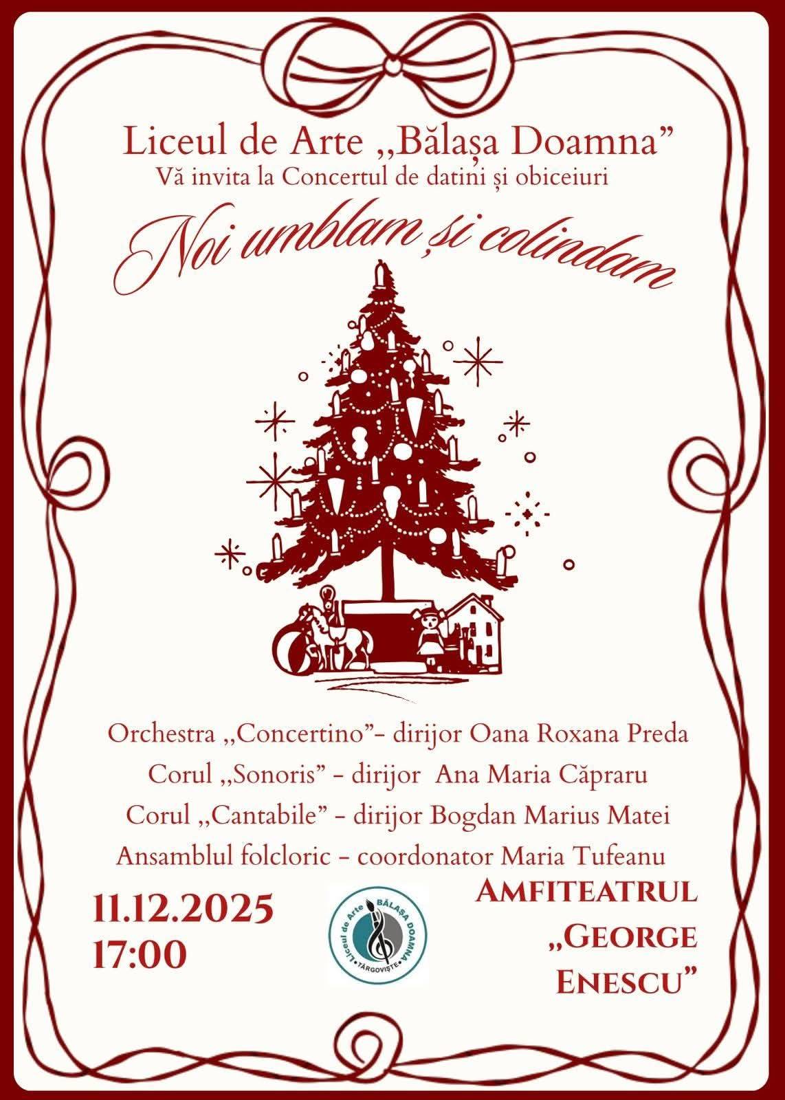 Joi, 11 decembrie 2025, începând cu ora 17:00, Amfiteatrul „George Enescu” din Târgoviște găzduiește un spectacol susținut de elevii Liceului de Arte „Bălașa Doamna”. Aceștia vor interpreta colinde, cântece de Crăciun și piese muzicale internaționale specifice sărbătorilor de iarnă, completate de momente coregrafice.