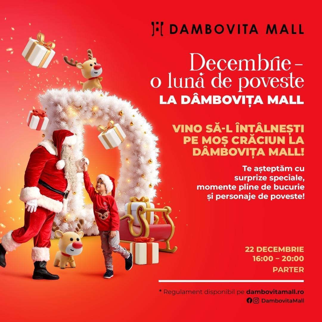 Atmosfera de sărbătoare se mută pe 22 decembrie la Dâmbovița Mall, unde cei mici vor avea ocazia să îl întâlnească pe Moș Crăciun într-un decor festiv, gratuit. Evenimentul se desfășoară între orele 16.00 și 20.00 și promite momente pline de emoție, potrivit reprezentanților centrului comercial.