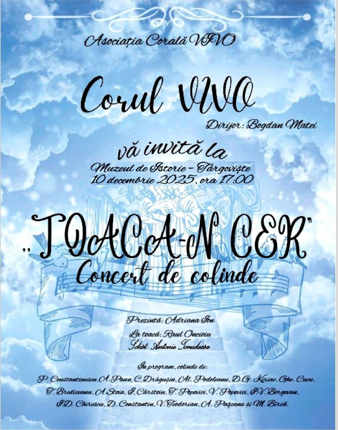 Un moment important va fi Concertul extraordinar de colinde intitulat „Toaca-n cer”, programat miercuri, 10 decembrie 2025, la Muzeul de Istorie din Târgoviște, începând cu ora 17.00. Corul va fi acompaniat de Raul Onicioiu la toacă și de Irina Mareș la pian, iar prezentarea va fi asigurată de Adriana Ion. Organizatorii vă așteaptă cu drag să vă bucurați de aceste interpretări festive.