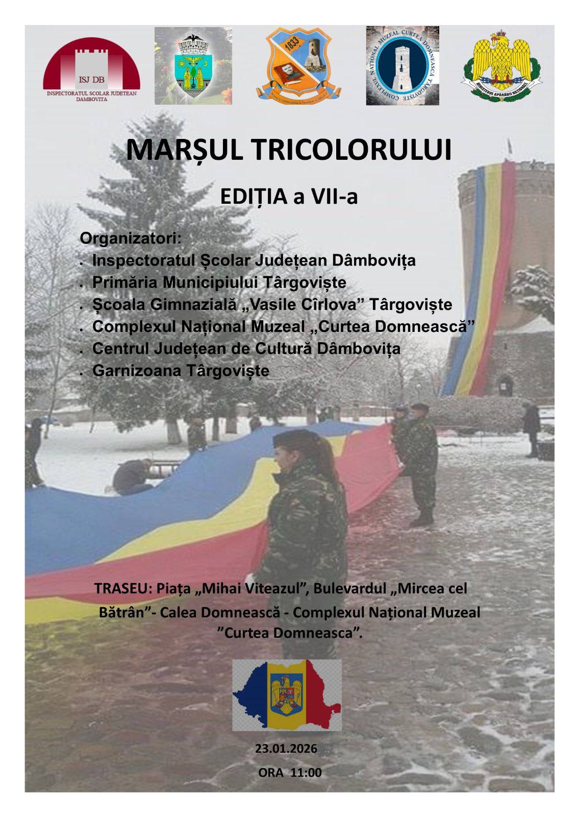 Școala Gimnazială „Vasile Cîrlova” din Târgoviște organizează ediția a VII-a a Marșului Tricolorului, un eveniment dedicat Unirii Principatelor Române. Potrivit organizatorilor, festivitatea va avea loc vineri, 23 ianuarie 2026, și adună elevi, profesori și instituții partenere într-un moment simbolic de patriotism.