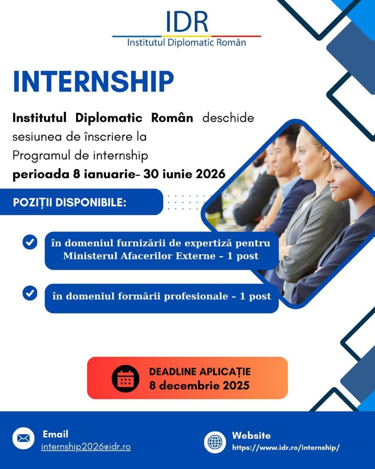 Institutul Diplomatic Român va organiza o rundă de internship între 8 ianuarie și 30 iunie 2026, care se va desfășura cu prezență fizică la sediul instituției. Programul este dedicat tinerilor absolvenți și oferă oportunitatea de a înțelege activitatea diplomatică și proiectele instituției, subordonată Ministerului Afacerilor Externe.