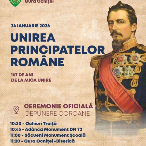 Primăria din Gura Ocniței anunță desfășurarea unor ceremonii dedicate Zilei Unirii Principatelor Române, sâmbătă, 24 ianuarie, în toate localitățile comunei, potrivit informațiilor oferite de administrația locală. Evenimentele sunt menite să onoreze memoria eroilor care au luptat pentru identitatea și demnitatea națională.