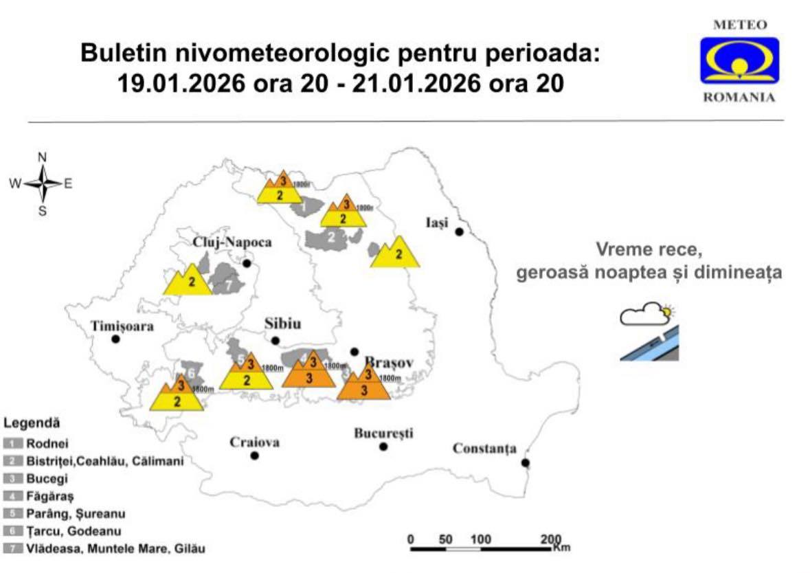 Masivul Bucegi continuă să fie afectat de o avertizare privind avalanșele, potrivit ultimului buletin nivometeorologic emis pentru perioada 19 ianuarie, ora 20, până pe 21 ianuarie, ora 20. Meteorologii mențin nivelul trei din cinci, ceea ce indică un risc însemnat atât în zona alpină, cât și la altitudini sub 1800 de metri, anunță serviciile meteo.