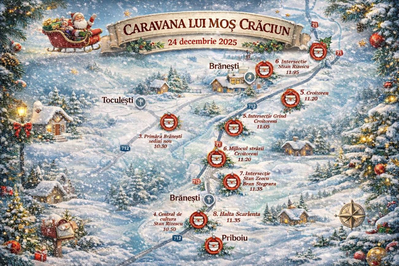 Astăzi, la ora 10:00, Moș Crăciun a început traseul în intersecția străzilor Mihai Viteazul și Hotarului din satul Toculești, comuna Brănești, unde va opri pe rând în toate punctele indicate pe harta publicată anterior de reprezentanții primăriei. Organizatorii au asigurat că vor fi vizitate zece puncte din Brănești, Toculești și Priboiu pentru a se asigura că niciun copil nu rămâne fără daruri.