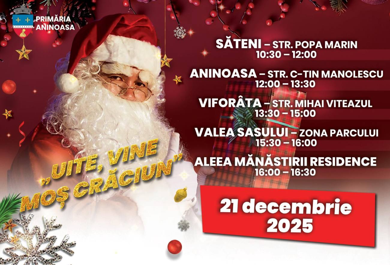 Spiritul sărbătorilor de iarnă continuă să aducă bucurie în comuna Aninoasa, unde Moș Crăciun va vizita toți copiii din localitate duminică, 21 decembrie 2025. Potrivit administrației locale, fiecare copil va avea ocazia să se întâlnească cu Moșul și să primească un cadou în cadrul unui traseu organizat în mai multe zone ale comunei.