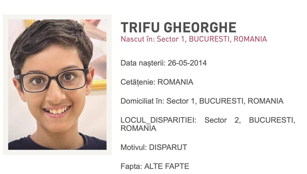 Poliția Capitalei a lansat o alertă extremă în cazul dispariției lui Trifu Gheorghe, un băiat de 11 ani din Sector 2, București, dat dispărut pe 24 ianuarie 2026, în jurul orei 18:30, potrivit %source%. Autoritățile solicită sprijinul cetățenilor pentru a-l găsi cât mai rapid.