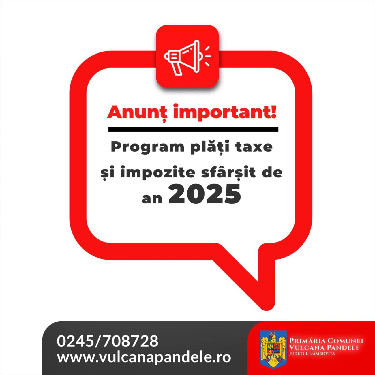 Locuitorii comunei Vulcana-Pandele sunt informați că programul de încasare a taxelor și impozitelor locale va suferi modificări odată cu încheierea exercițiului fiscal 2025. Primăria comunei detaliază termenele limită pentru plățile în numerar și prin mijloace electronice, precum și programul pentru începutul anului 2026, conform anunțului oficial.