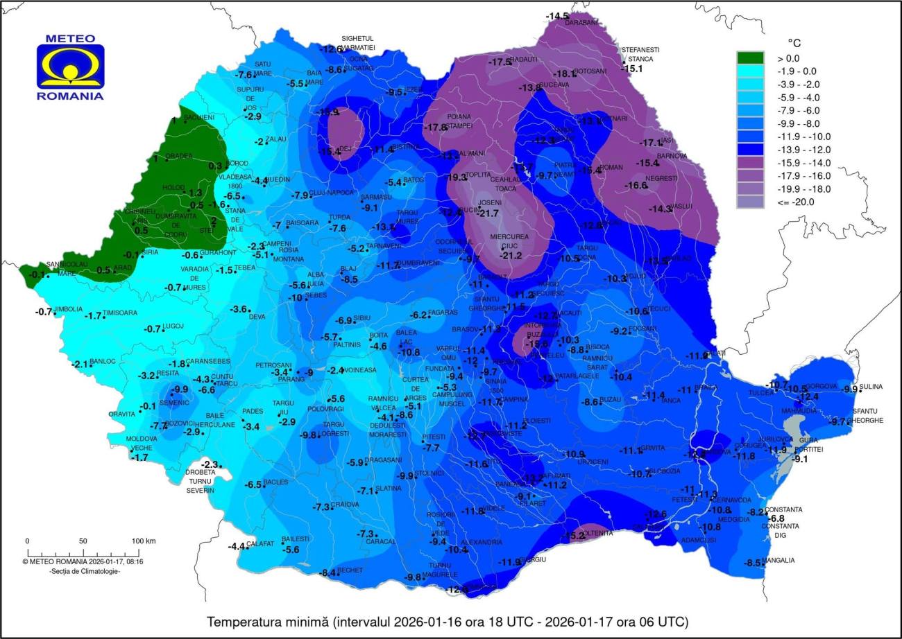 Pe 17 ianuarie, România a înregistrat unele dintre cele mai reci dimineți ale acestei ierni, cu valori termice ce au scăzut drastic în multiple regiuni. Administrația Națională de Meteorologie confirmă această situație și menține informarea privind vremea deosebit de rece, valabilă până pe 21 ianuarie, și anunță fenomene meteo ce pot afecta circulația și activitățile cotidiene.