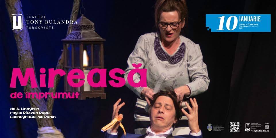 Teatrul „Tony Bulandra” din Târgoviște îi invită pe pasionații de teatru să participe la o nouă reprezentație a comediei „Mireasă de împrumut”, ce va avea loc sâmbătă, 10 ianuarie, de la ora 19:00, în Sala Mare. Evenimentul este o oportunitate de a petrece o seară plină de umor și situații amuzante, potrivit comunicatului teatral.