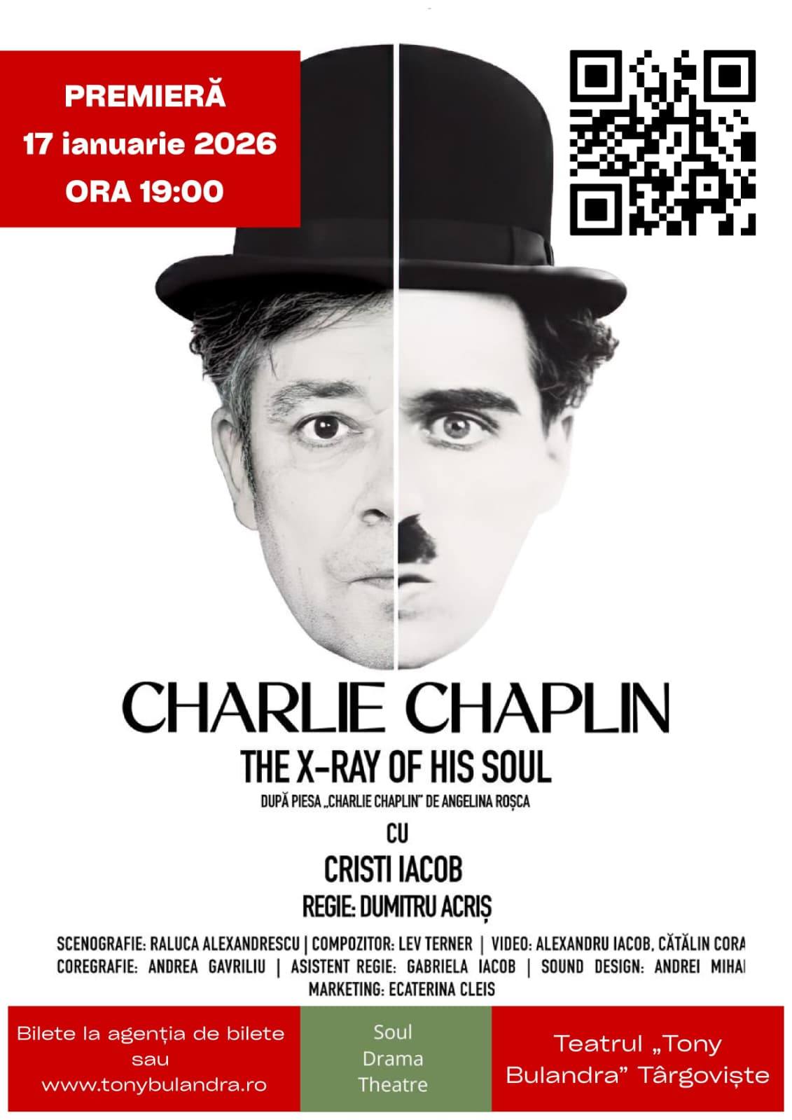 Montarea, bazată pe piesa „Charlie Chaplin” de Angelina Roșca și regizată de Dumitru Acriș, îl aduce în prim-plan pe actorul Cristi Iacob, care oferă o interpretare plină de poezie și umanitate. Spectacolul nu se limitează la o simplă biografie sau la reconstituirea momentelor faimoase ale actorului, ci propune o pătrundere subtilă în procesul creației și în tensiunile pe care le-a traversat Chaplin.