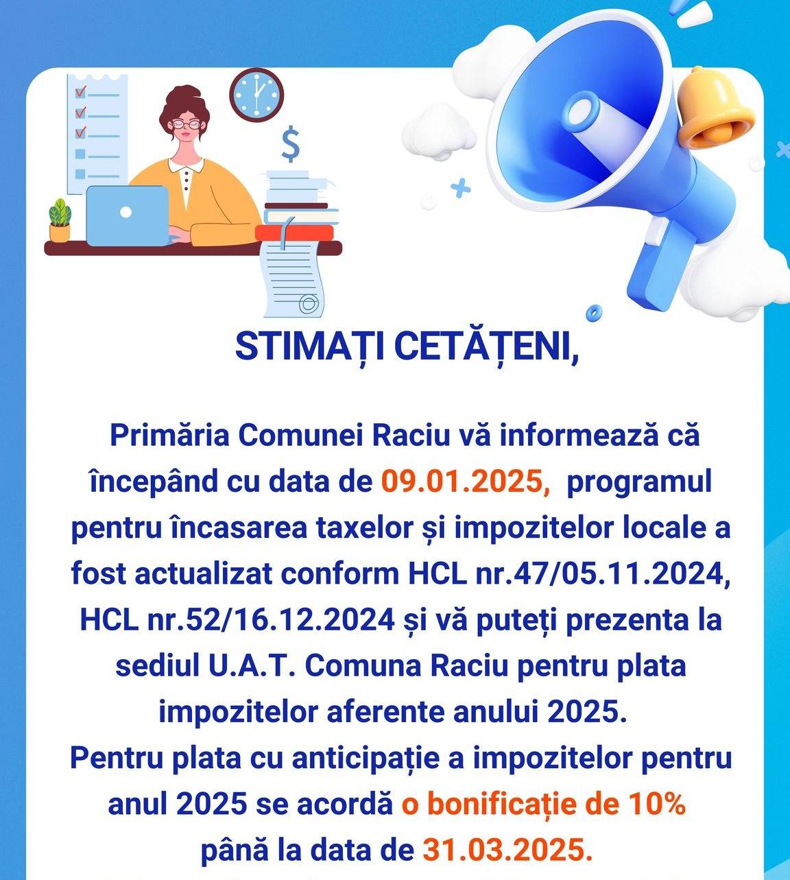Primăria Comunei Raciu aduce la cunoștința cetățenilor că, începând cu 9 ianuarie 2025, programul de încasare a taxelor și impozitelor locale va fi actualizat. Această modificare este în conformitate cu HCL nr.47/05.11.2024 și HCL nr.52/16.12.2024.