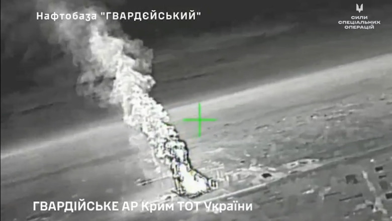 „Rezultatul acțiunilor de succes ale Forțelor Speciale de Operațiuni ale Ucrainei este distrugerea depozitului de petrol din satul Gvardiiskîi”, a transmis o sursă oficială ucraineană. Acțiunea face parte dintr-o operațiune mai amplă cu drone vizând diverse obiective militare ruse din teritoriile ocupate și din interiorul Rusiei.