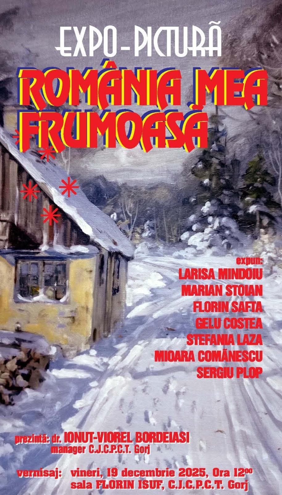 Vineri, 19 decembrie 2025, Centrul Județean pentru Conservarea și Promovarea Culturii Tradiționale Gorj va găzdui un eveniment artistic special la Sala Florin Isuf din Târgu Jiu, începând cu ora 12:00. Expoziția de pictură reunește creații ale unor artiști reputați, ce aduc un omagiu atmosferei magice a iernii, conform sursei oficiale.