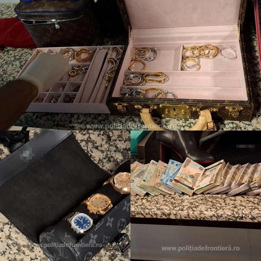 Poliția de Frontieră informează că, în urma unui control efectuat la Aeroportul Henri Coandă, au fost găsite bijuterii și ceasuri de lux în bagajele a două femei care reveneau din Dubai. Au fost identificate obiecte din metal galben, posibil aur, și sume importante de bani nedeclarate, iar autoritățile au demarat cercetări pentru tentativă la contrabandă, potrivit Poliției de Frontieră.
